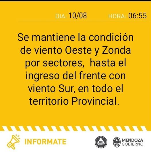 El pronóstico del tiempo de la Dirección de Contingencias Climáticas y el Servicio Meteorológico Nacional informa que este miércoles habrá viento Zonda desde las 2 de la mañana en cordillera, desplazándose hacia Malargüe.