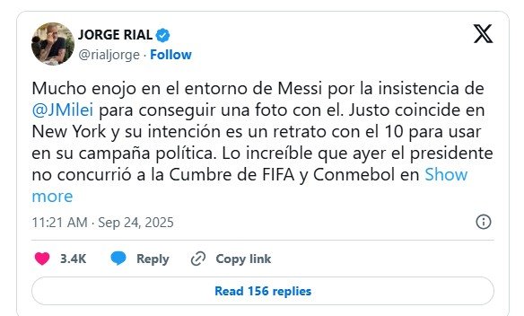 Tras darle la espalda a la iniciativa 2030 de Conmebol, el presidente buscó insistentemente la foto con Leo, que hoy juega con Inter Miami en la mencionada ciudad ante New York City. Karina Milei, Daniel Scioli y Gerardo Werthein la venían gestionando hace 20 días, pero no habrá imagen con el astro, que era buscada de cara a las elecciones del 26/10.