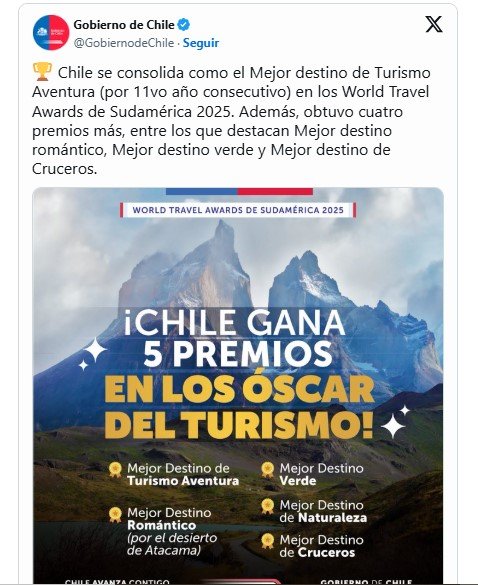 Chile domina los “World Travel Awards” de Sudamérica 2025 al ganar cinco galardones, incluyendo un histórico reconocimiento a sus atractivos…